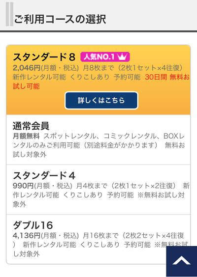 例えば「スタンダード8」は毎月8枚まで、DVD/Blu-ray/CDの新作・準新作・旧作を借りることができます。